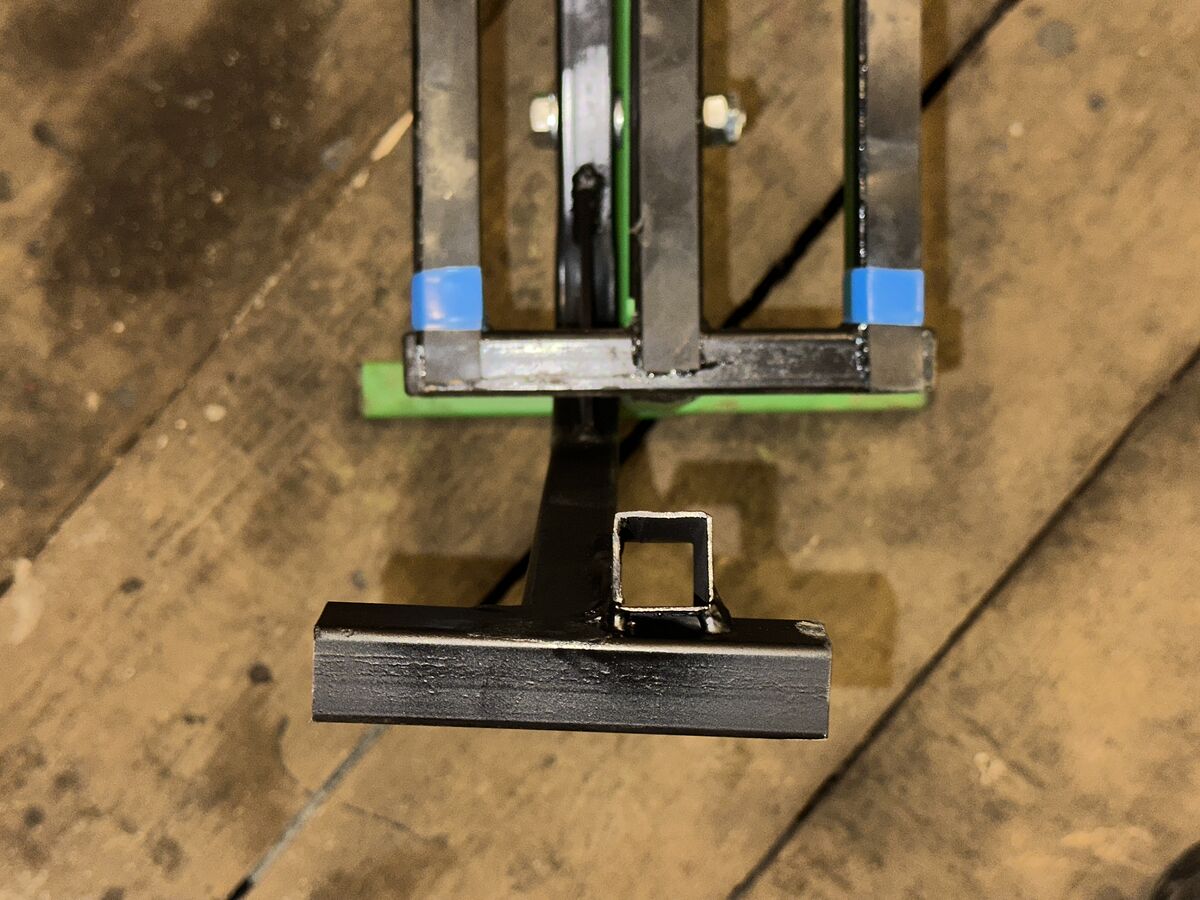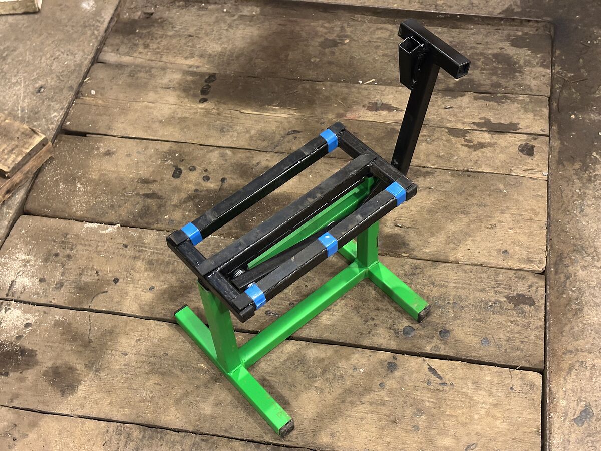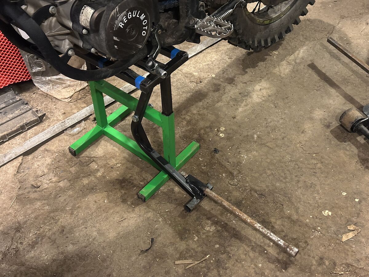 Ручка подъема нажималась с ощутимым усилием и давил я на неё своей массой. Теперь же, она упёрлась в пол и довольно короткая, чтобы за неё тянуть руками. Одной рукой мне не хватит сил, а двумя кто будет тогда держать мот? Кое-как снял мот с подставки при помощи еще одной профильной трубы подсунутой сбоку. Так мне и пришла в голову идея приварить под углом направляшку для съемной ручки и удлиннения рычага.